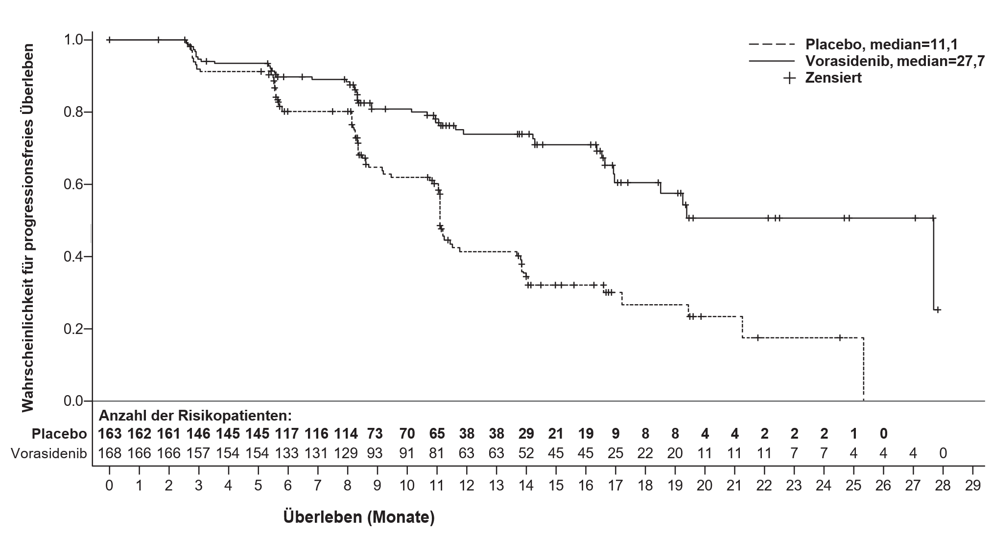 Eine aktualisierte PFS-Analyse des BIRC, die bei 96 % (N = 158) der Ereignisse durchgeführt wurde, bestätigte den Nutzen von Vorasidenib im Vergleich zu Placebo (Hazard Ratio: 0,35 [95 % KI: 0,25, 0,49]). Nach 24 Monaten betrug die progressionsfreie Überlebensrate 59 % (95 % KI: 48,4, 67,8) in der Vorasidenib-Gruppe und 26 % (95 % KI: 17,9, 35,3) in der Placebo-Gruppe. Das mediane progressionsfreie Überleben (PFS) war für den Vorasidenib-Arm nicht schätzbar (95 % KI: 22,1, nicht schätzbar) und betrug für den Placebo-Arm 11,4 (95 % KI: 11,1, 13,9) Monate.
