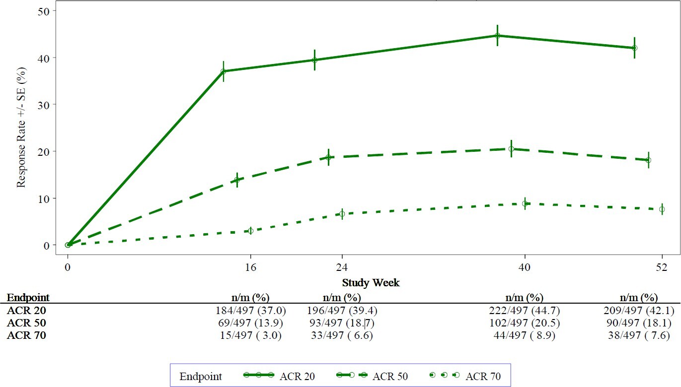 In zulassungsrelevanten Studien wurde die größte Verbesserung innerhalb der ersten 24 Wochen der Behandlung einer PsA und PSOR und innerhalb der ersten 12 Wochen der Behandlung eines BS beobachtet.