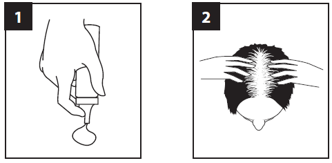 Das Haar wird im ausgedünnten Bereich gescheitelt, damit der Schaum auf einen möglichst großen Teil der Kopfhaut aufgetragen werden kann. Eine ausreichende Menge des Schaums wird mit den Fingerspitzen auf die betroffenen Stellen der Kopfhaut aufgetragen und sanft einmassiert, beginnend am Hinterkopf Richtung Vorderkopf (siehe Abbildung 2).