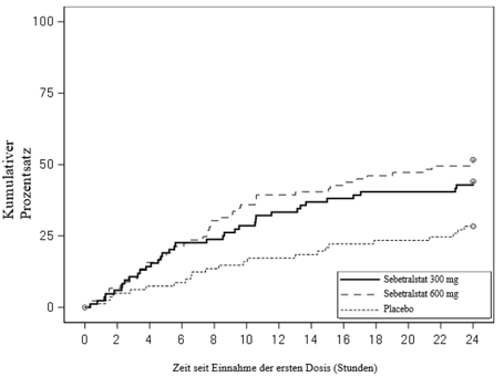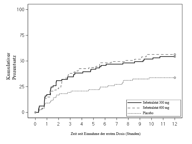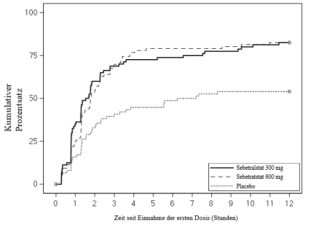 Die Zeit bis zum Einsetzen der Symptomlinderung war unter 300 mg Sebetralstat (Bonferroni-korrigiert p < 0,0001) und 600 mg Sebetratstat (Bonferroni-korrigiert p < 0,0013) statistisch signifikant kürzer als unter Placebo (Abbildung 1).
