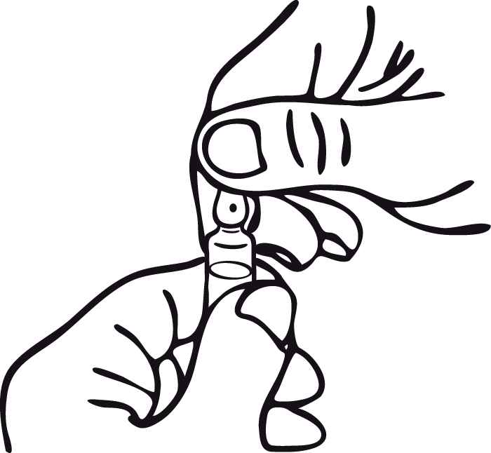 Aufgrund der vorgeritzten Kerbe unterhalb des farbigen Punktes der Ampulle ist es nicht erforderlich, den Ampullenhals zu feilen. Vor dem Öffnen der Ampulle ist sicherzustellen, dass die gesamte Lösung aus dem oberen Teil der Ampulle in den unteren Teil geflossen ist. Beide Hände sind zum Öffnen zu benutzen; während der untere Teil der Ampulle von einer Hand gehalten wird, bricht die andere Hand den oberen Teil der Ampulle entgegen der Punktrichtung ab.