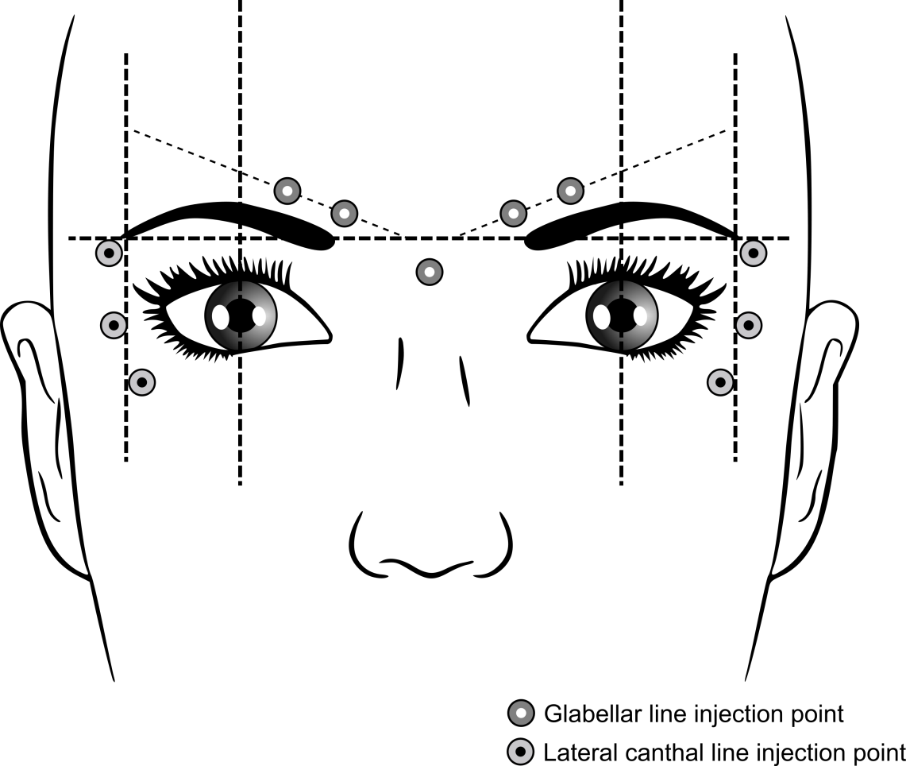 Die empfohlenen Injektionspunkte für Glabellafalten und laterale Augenfalten sind unten beschrieben: