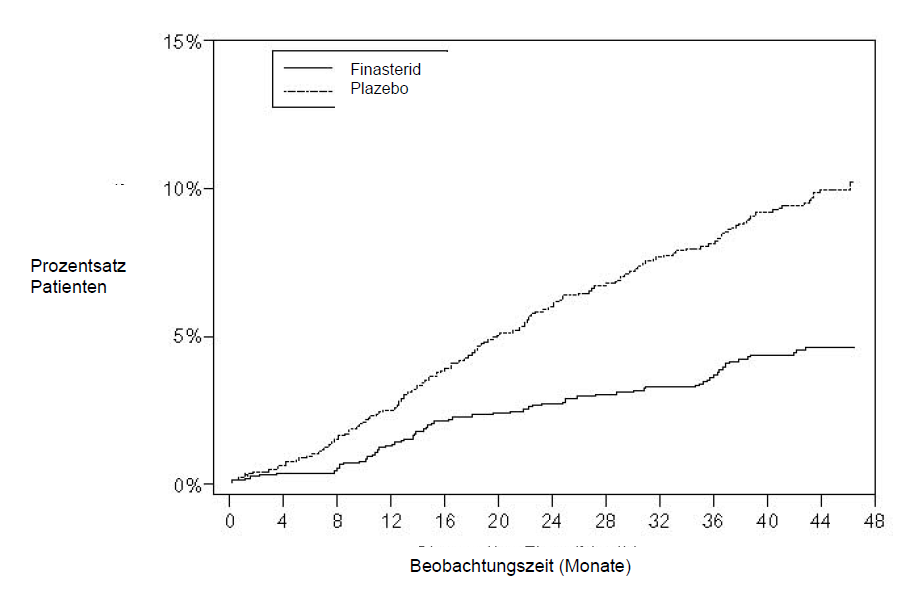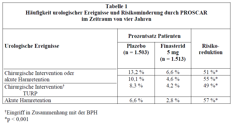 In der vierjährigen PLESS-Studie wurde bei 13,2 % der Patienten unter Placebo im Vergleich zu 6,6 % der Patienten unter Finasterid 5 mg ein chirurgischer Eingriff oder eine Katheterisierung wegen eines akuten Harnverhalts erforderlich, wodurch gezeigt wurde, dass im Zeitraum von vier Jahren durch die Gabe von Finasterid 5 mg das Risiko für eine chirurgische Intervention oder akute Harnretention um insgesamt 51 % verringert wurde. Das Risiko für eine chirurgische Intervention sank unter Finasterid 5 mg um 55 % (10,1 % unter Placebo vs. 4,6 % unter Finasterid 5 mg), das Risiko für eine akute Harnretention wurde um 57 % vermindert (6,6 % unter Placebo vs. 2,8 % unter Finasterid 5 mg). Diese Risikoverringerung war schon bei der ersten Nachuntersuchung nach vier Monaten evident und blieb während der gesamten vierjährigen Studiendauer aufrechterhalten (siehe Abb. 1 und 2). In Tabelle 1 sind die Häufigkeiten und die Risikoverringerung urologischer Ereignisse während der Studie zusammengestellt.