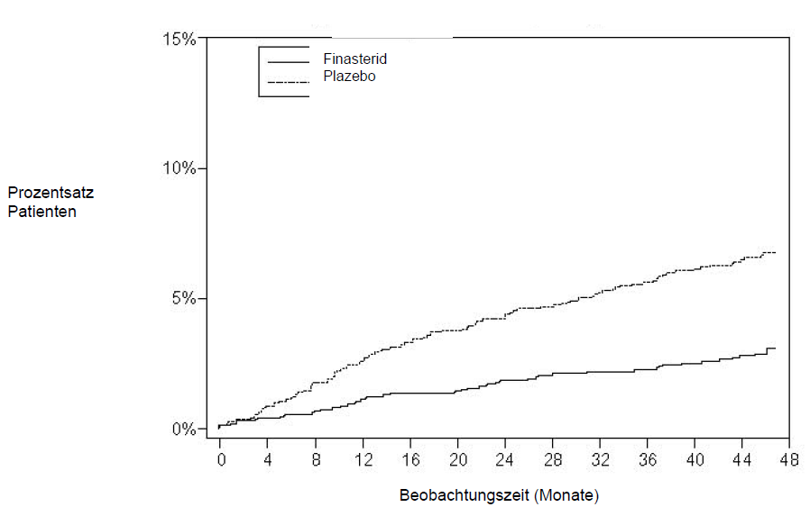 Aus einer 7-jährigen Placebo-kontrollierten Studie an 18.882 gesunden Männern (≥ 55 Jahre), mit normalem rektalen Tastbefund und einem PSA ≤ 3,0 ng/ml lagen für 9.060 Männer die Daten einer Nadelbiopsie der Prostata zur Analyse vor. Dabei wurden Prostatakarzinome bei 803 Männern (18,4 %) unter Finasterid 5 mg und bei 1.147 Männern (24,4 %) unter Placebo festgestellt.