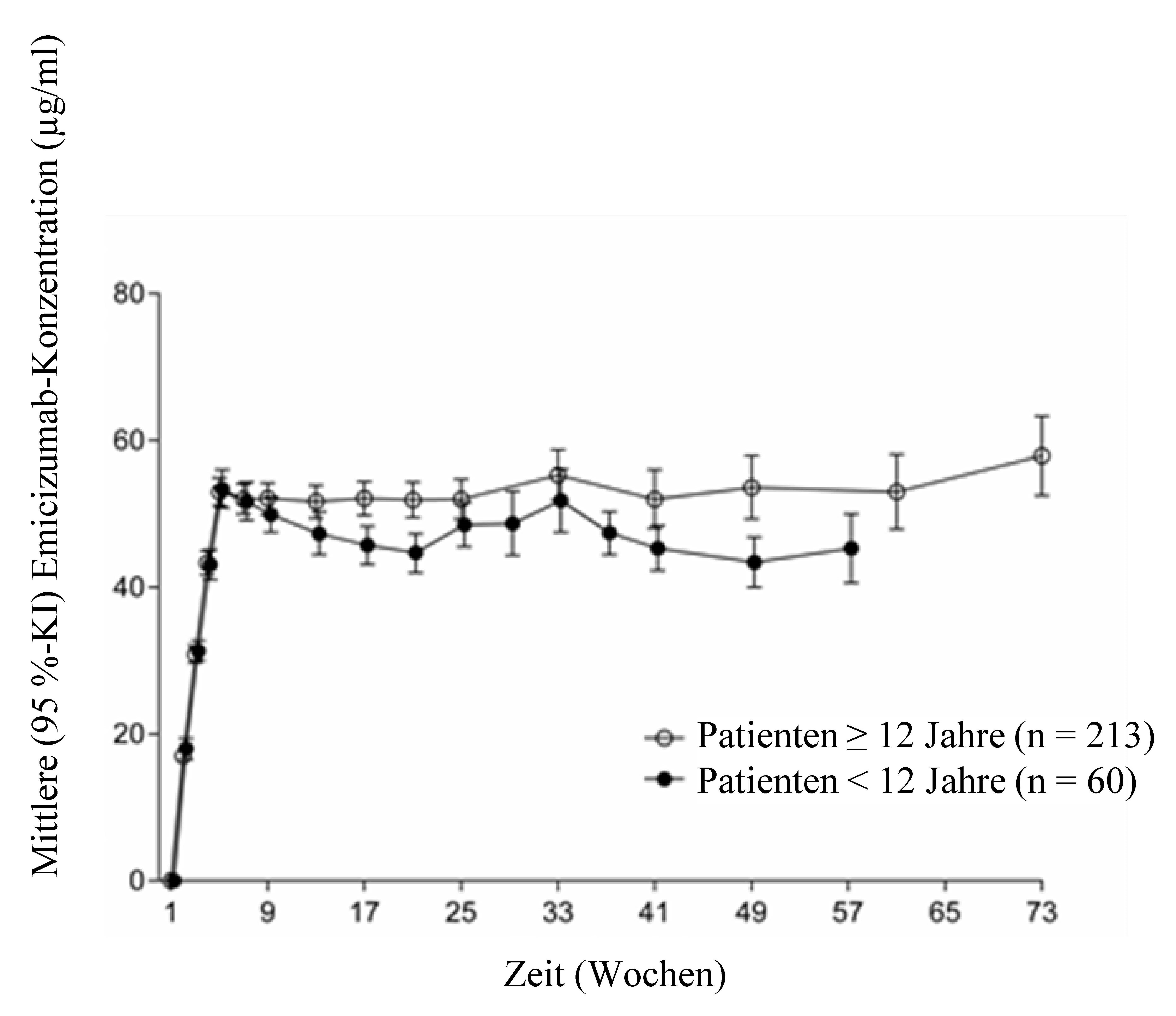 Nach wöchentlicher Dosierung (3 mg/kg/Woche über 4 Wochen gefolgt von 1,5 mg/kg/Woche) bei Erwachsenen/Jugendlichen (≥ 12 Jahre) und Kindern (< 12 Jahre) wurden ähnliche PK-Profile beobachtet (siehe Abbildung 1).