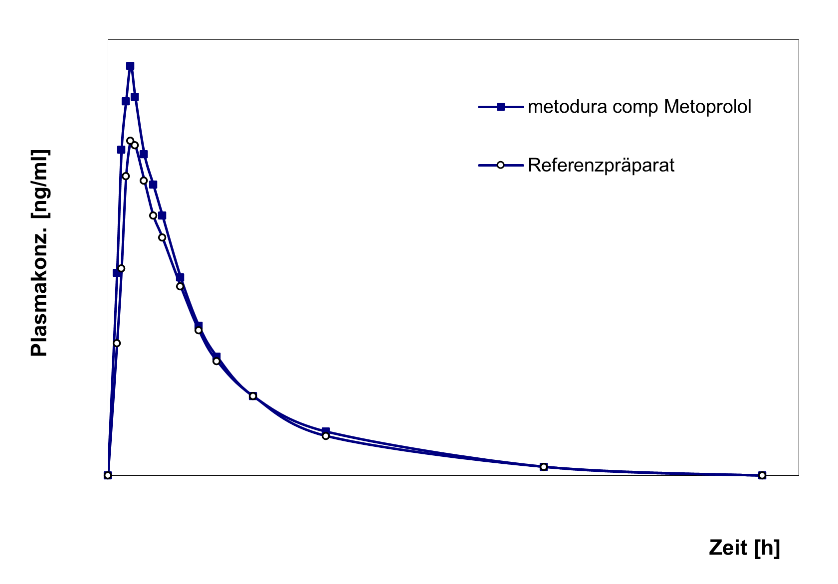 Mittlere Plasmaspiegelverläufe im Vergleich zu einem Referenzpräparat in einem Konzentrations- Zeit-Diagramm (Abb.1):