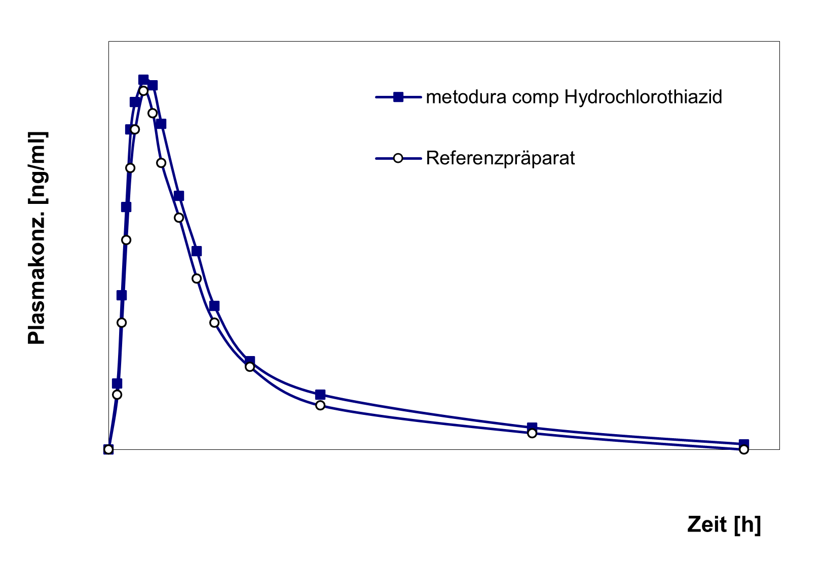 Mittlere Plasmaspiegelverläufe im Vergleich zu einem Referenzpräparat in einem Konzentrations- Zeit-Diagramm (Abb. 2):
