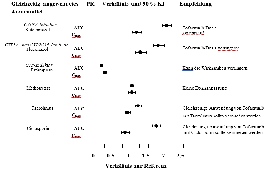 Die tägliche Tofacitinib-Gesamtdosis sollte bei Patienten, die starke Inhibitoren von Cytochrom P450 (CYP) 3A4 (z. B. Ketoconazol) erhalten, und bei Patienten, die gleichzeitig mindestens ein Arzneimittel erhalten, das zu einer mittelstarken Hemmung von CYP3A4 und zu einer starken Hemmung von CYP2C19 führt (z. B. Fluconazol, siehe Abschnitt 4.5), wie folgt halbiert werden: