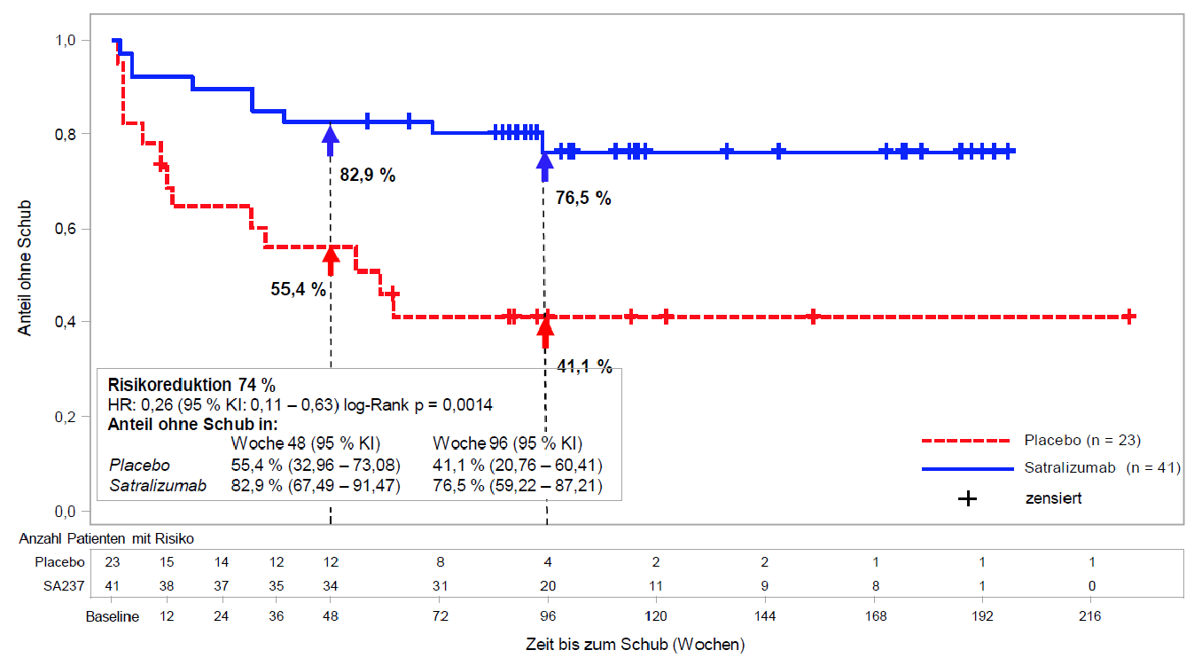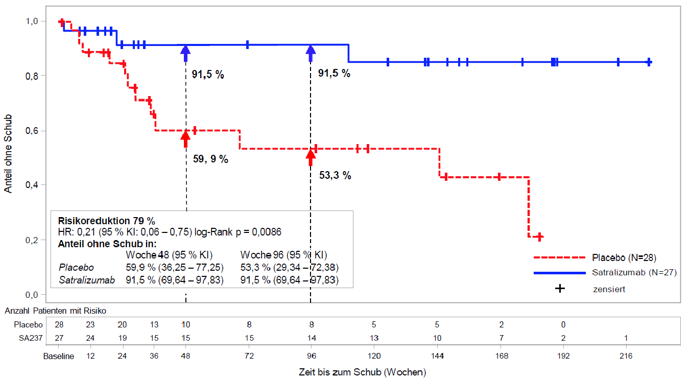 Die Behandlung mit Satralizumab bei AQP4-IgG-seropositiven Patienten verringerte das Risiko für das Auftreten eines schweren Schubs, definiert als EDSS-Anstieg um ≥ 2 Punkte im Vergleich zur vorherigen EDSS-Bewertung, in Studie BN40898 um 85 % (Zeit bis zum bestätigten schweren Schub während der doppelblinden Phase; HR = 0,15; 95-%-KI: 0,02 – 1,25; p = 0,0441) und in Studie BN40900 um 79 % (HR = 0,21; 95-%-KI: 0,05 – 0,91; p = 0,0231) im Vergleich zur Behandlung mit Placebo.