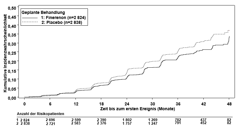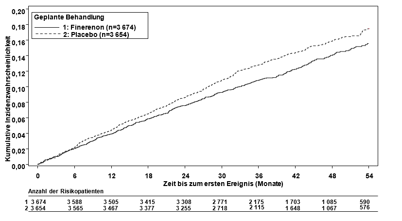 Aufgrund begrenzter klinischer Daten sollte die Finerenon-Behandlung bei Patienten mit Progression zur terminalen Niereninsuffizienz (eGFR < 15 ml/min/1,73 m2) beendet werden (siehe Abschnitt 4.4).