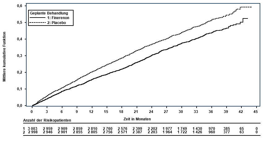 Im Vergleich zu Patienten mit normaler Nierenfunktion (CLCR ≥ 90 ml/min) war die Auswirkung einer mittelschweren (CLCR 30 bis < 60 ml/min) oder schweren (CLCR < 30 ml/min) Nierenfunktionsstörung auf die AUC von Finerenon mit einem Anstieg um 34‑36 % ähnlich. Eine mittelschwere oder schwere Nierenfunktionsstörung hatte keine Auswirkung auf die Cₘₐₓ (siehe Abschnitt 4.2).