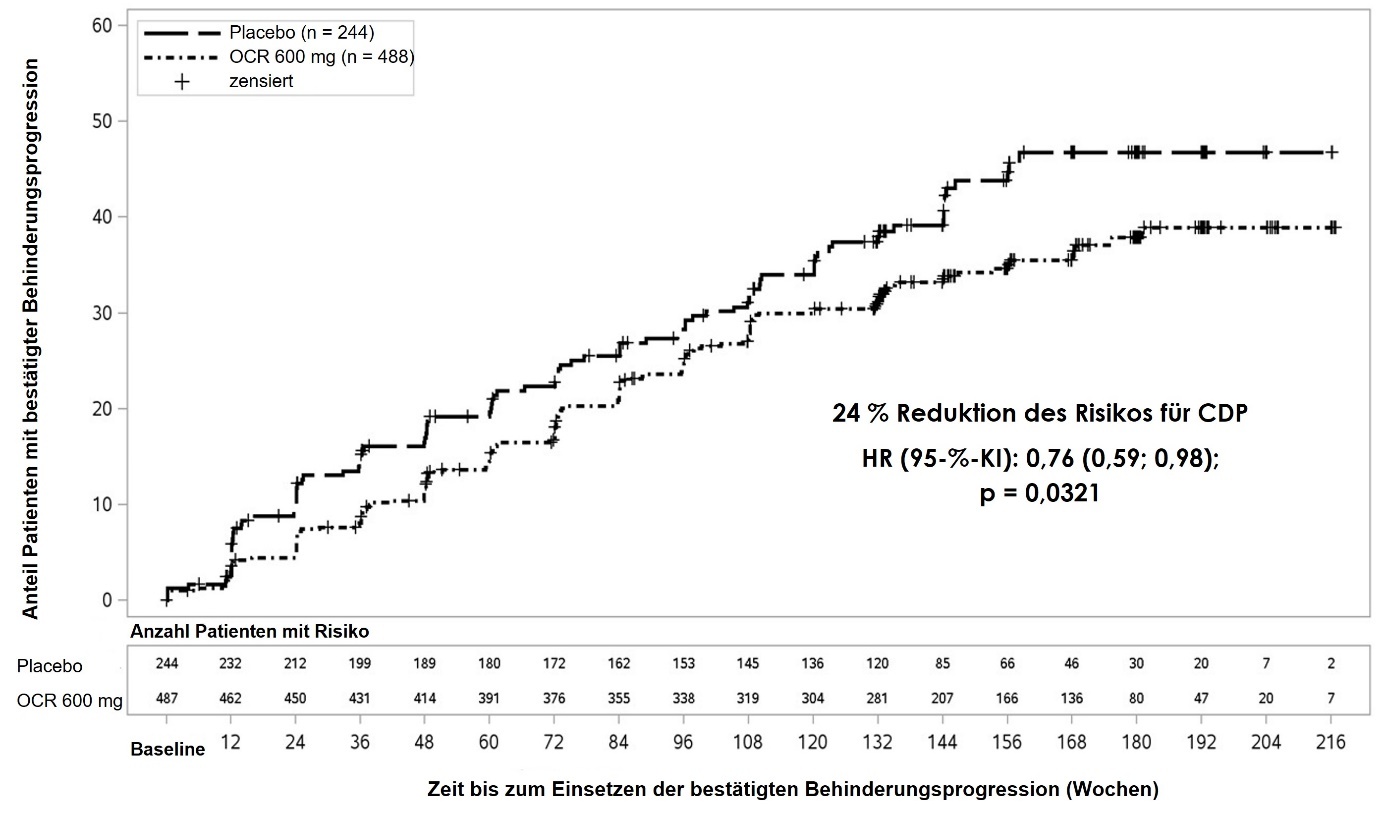 In der verlängerten Kontrollperiode (ECP, Extended Controlled Period), die eine doppelt verblindete Behandlung und ca. 9 zusätzliche Monate kontrollierte Nachbeobachtung vor der Fortsetzung in der open-label extension (OLE) oder bis zum Abbruch der Studienbehandlung beinhaltet, wurden Post-hoc-Analysen durchgeführt. Der Anteil der Patienten mit einer 24-wöchigen bestätigten Behinderungsprogression von EDSS ≥ 7,0 (24W-CDP von EDSS ≥ 7,0; Zeit bis zur Rollstuhlpflicht) betrug 9,1 % in der Placebo-Gruppe im Vergleich zu 4,8 % in der Ocrelizumab-Gruppe in Woche 144, was zu einer 47%igen Risikoreduktion der Zeit bis zur Rollstuhlpflicht (HR 0,53, [0,31; 0,92]) während der ECP führte. Da diese Ergebnisse explorativer Natur waren und Daten nach Entblindung einschlossen, sollen die Ergebnisse mit Vorsicht interpretiert werden.