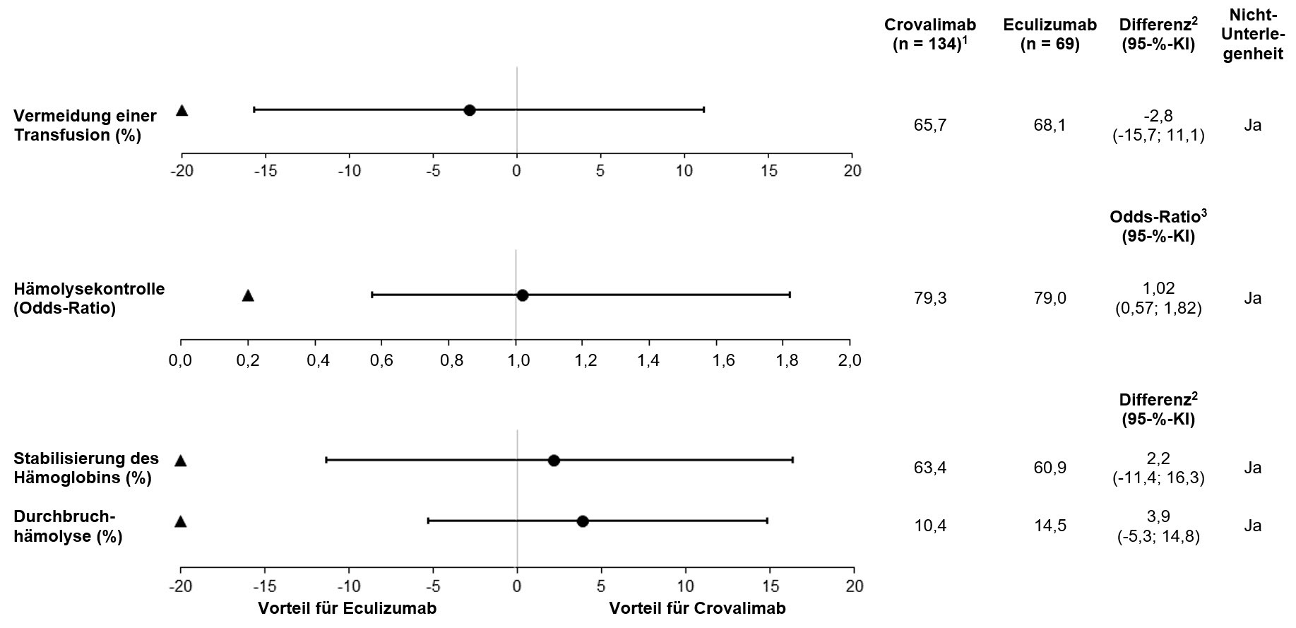 Die Sicherheit von Crovalimab bei Patienten mit PNH wurde in drei Phase-III-Studien, COMMODORE 2 (BO42162), COMMODORE 3 (YO42311) und COMMODORE 1 (BO42161), sowie einer Phase-I/II-Studie (COMPOSER, BP39144) untersucht.