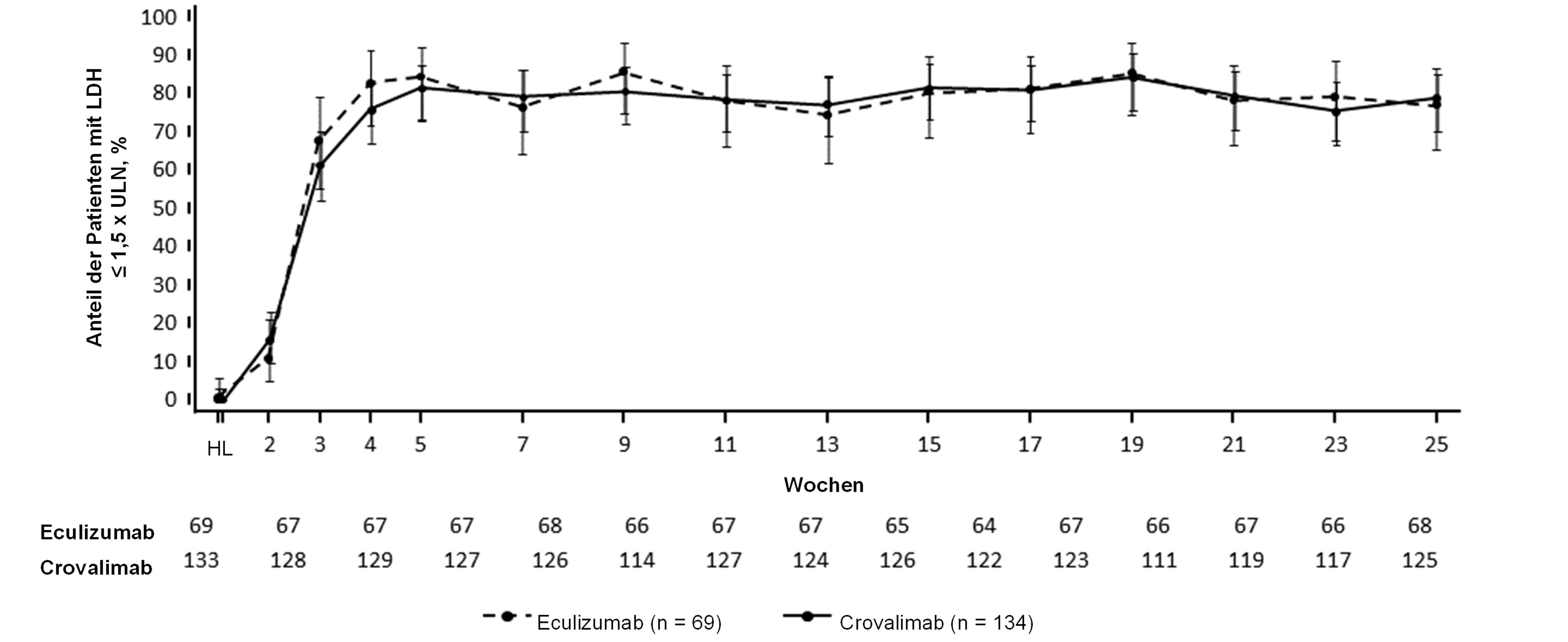 Patienten können Anti-Wirkstoff-Antikörper (antidrug antibodies, ADA) entwickeln, die die Crovalimab-Exposition beeinträchtigen können. Die Entwicklung von ADA kann einen Verlust der Crovalimab-Exposition bewirken, was in der Folge zu einem Verlust der Wirksamkeit von Crovalimab führen kann. In klinischen Studien wurde bei Patienten, die mit Crovalimab behandelt wurden, ein Wirksamkeitsverlust und ein Expositionsverlust infolge der Entwicklung von ADA beobachtet. Die Patienten sind routinemäßig auf klinische Anzeichen eines Expositions- und eines Wirksamkeitsverlusts, einschließlich schwerwiegender intravaskulärer Hämolyse, zu überwachen. Im Falle einer persistierenden schwerwiegenden intravaskulären Hämolyse trotz konformer Behandlung mit Crovalimab sind die Patienten umgehend zu untersuchen, um die Ätiologie zu beurteilen und die Möglichkeit in Betracht zu ziehen, dass die Entwicklung von ADA zu einem Verlust der Exposition und Wirksamkeit führt. Eine Nutzen-Risiko-Bewertung der Fortführung der Crovalimab-Therapie ist durchzuführen und ein Wechsel zu einer anderen Therapie zu erwägen. Patienten/Betreuungspersonen sind anzuweisen, sofort einen Arzt aufzusuchen, wenn der Patient Anzeichen einer Verschlechterung der PNH entwickelt. Siehe Abschnitte 4.8 und 5.1.