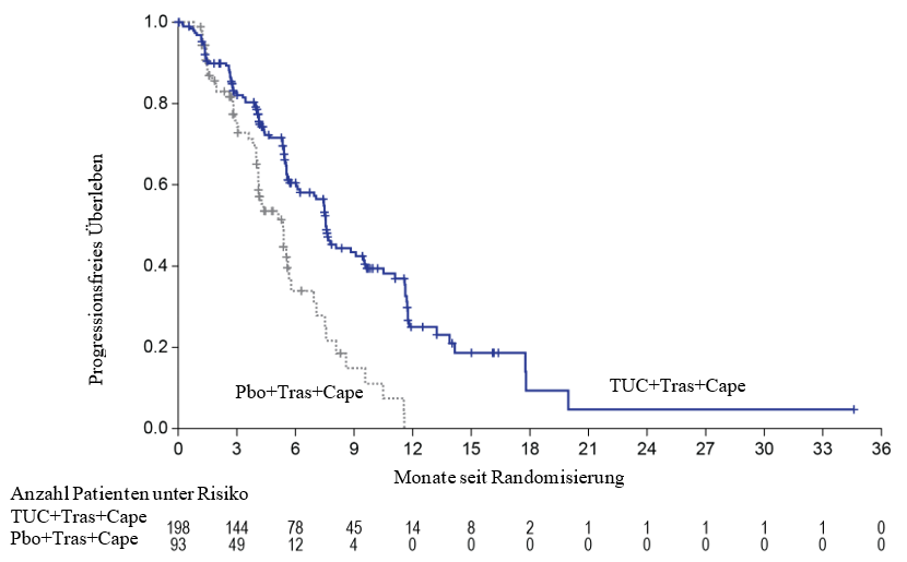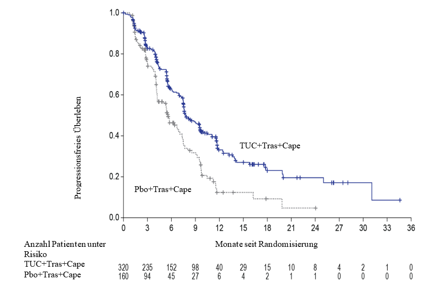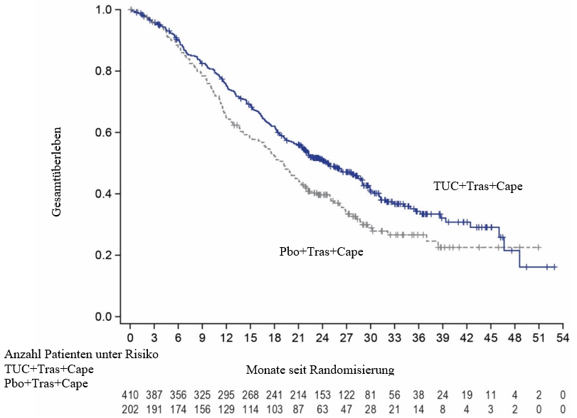 Wie im Prüfplan vorgesehen, wurde etwa zwei Jahre nach der Randomisierung des letzten Patienten die finale OS-Analyse auf der Grundlage von 370 Ereignissen durchgeführt, was einem medianen Follow-up von 29,6 Monaten entsprach. Das mediane OS betrug 24,7 Monate (95%‑KI: 21,6; 28,9) für Patienten im Tucatinib + Trastuzumab + Capecitabin-Arm im Vergleich zu 19,2 Monaten (95%‑KI: 16,4; 21,4) für Patienten im Placebo + Trastuzumab + Capecitabin-Arm (HR = 0,725; 95%‑KI: 0,585; 0,898). Die finale OS-Analyse ist in Abbildung 3 dargestellt.