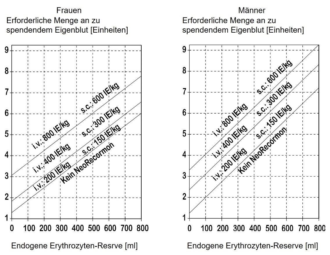 Die Notwendigkeit für eine Behandlung mit NeoRecormon sowie gegebenenfalls die Einzeldosis werden aus der erforderlichen Menge an zu spendendem Eigenblut und der endogenen Erythrozyten-Reserve anhand der folgenden Grafiken abgelesen: