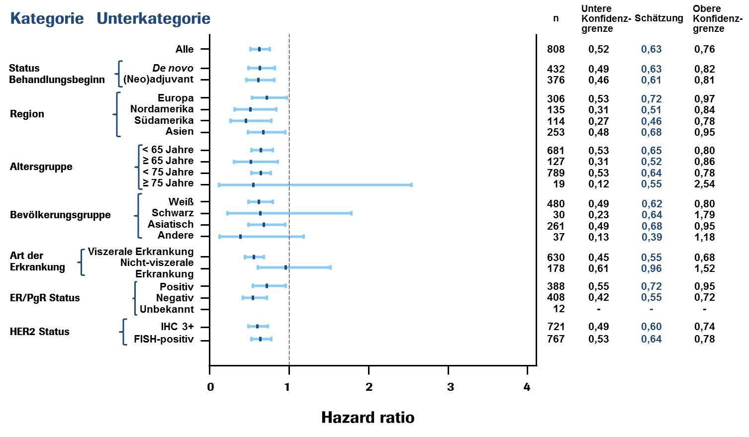 Zum Zeitpunkt der Primäranalyse zeigten sich deutlichere Vorteile von Perjeta bei Patienten in bestimmten Gruppen mit hohem Risiko, insbesondere bei Patienten mit nodal-positiver oder Hormonrezeptor-negativer Erkrankung (siehe Tabelle 6).
