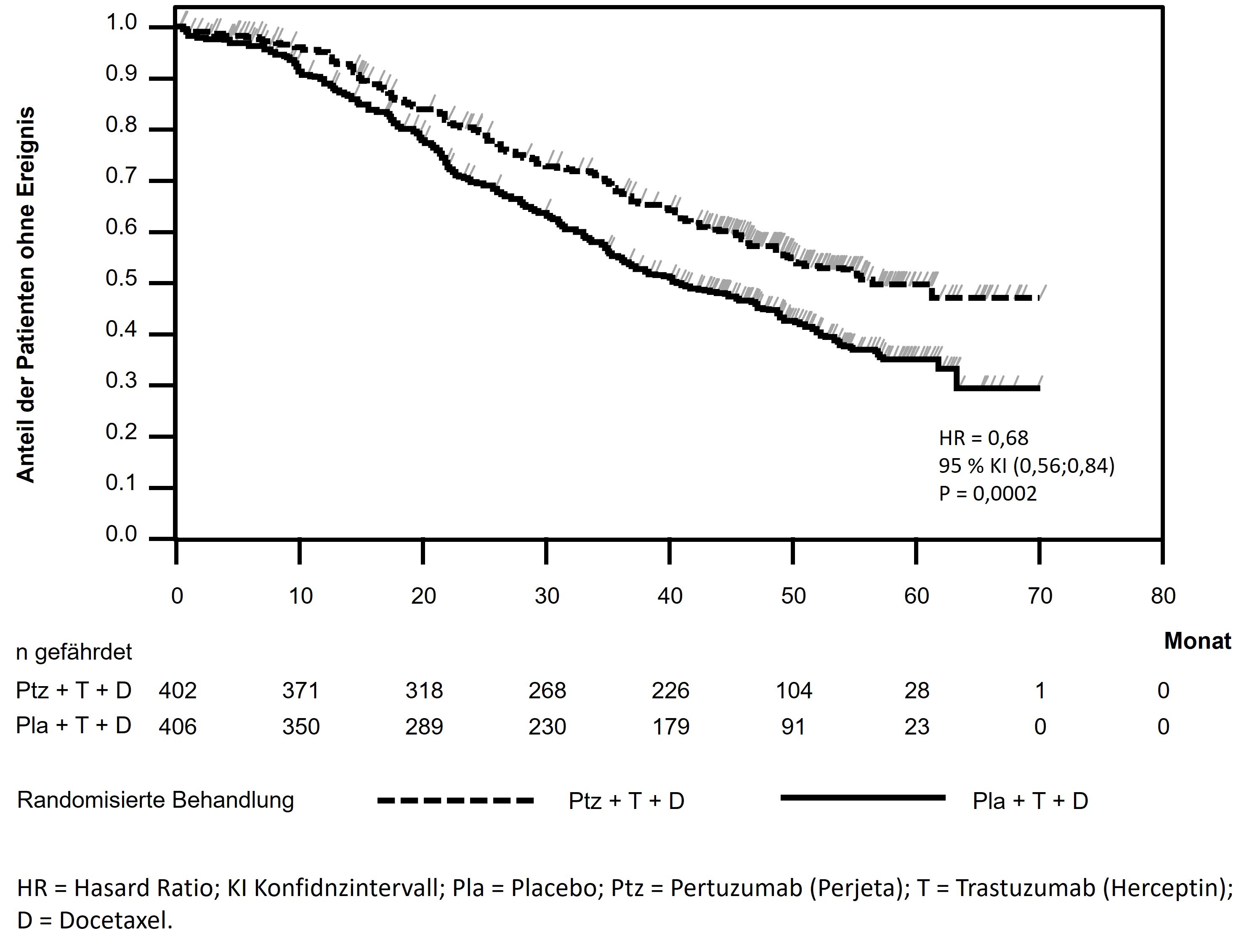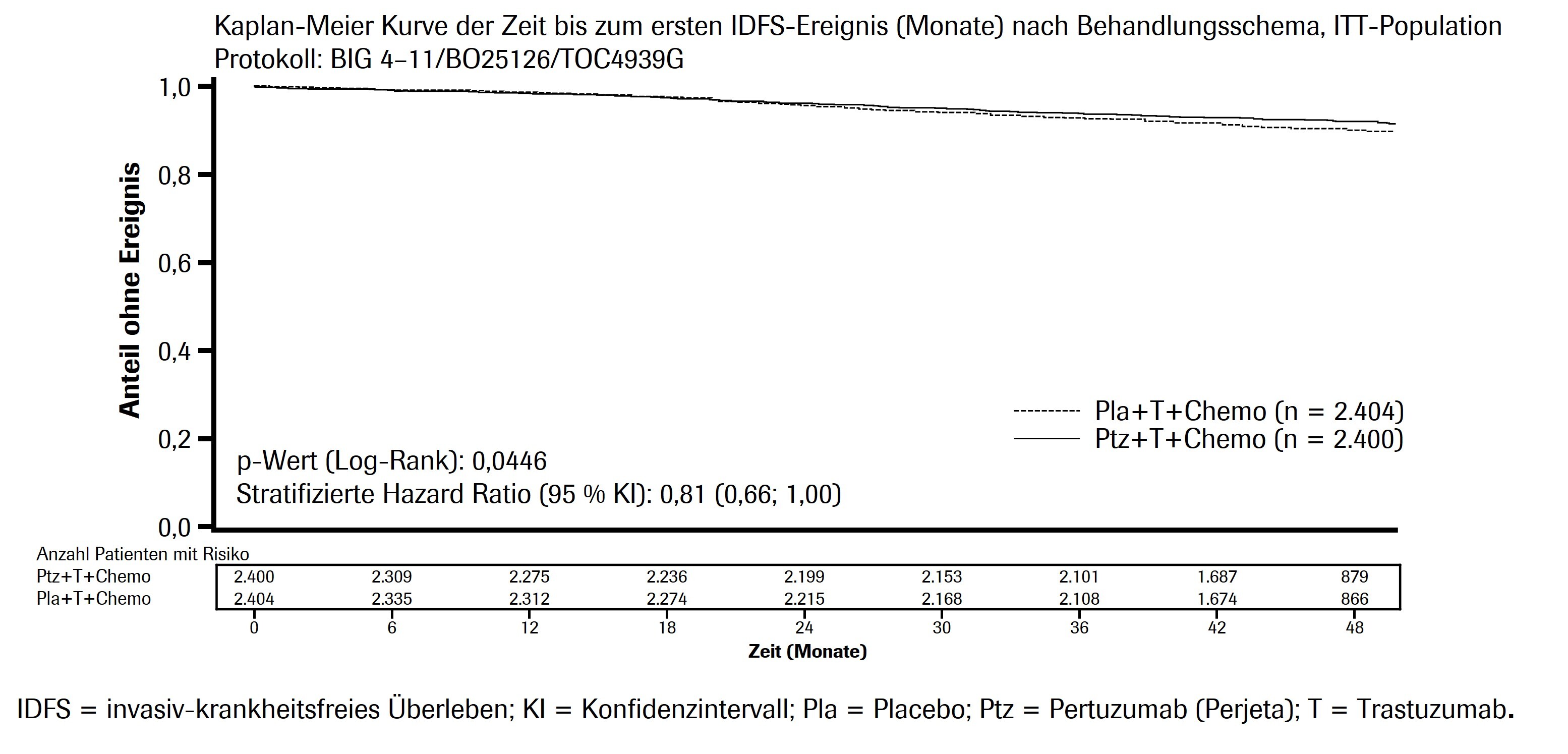 Nach 4 Jahren lag das IDFS laut Schätzung in der Gruppe der mit Perjeta behandelten Patienten bei 92,3 % und in der Gruppe der mit Placebo behandelten Patienten bei 90,6 %. Die mediane Nachbeobachtungszeit betrug zum Bestimmungszeitpunkt 45,4 Monate.