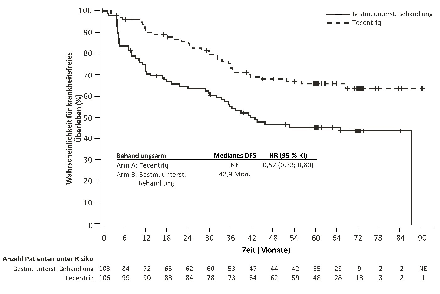 Tecentriq als Monotherapie wird angewendet zur adjuvanten Behandlung des NSCLC nach vollständiger Resektion und platinbasierter Chemotherapie bei erwachsenen Patienten mit hohem Risiko für ein Rezidiv und deren Tumoren eine PD‑L1‑Expression auf ≥ 50 % der Tumorzellen (tumour cells, TC) aufweisen und kein EGFR(epidermal growth factor receptor, epidermaler Wachstumsfaktorrezeptor)‑mutiertes oder ALK(anaplastische-Lymphomkinase)‑positives NSCLC haben (siehe Abschnitt 5.1 zu den Auswahlkriterien).